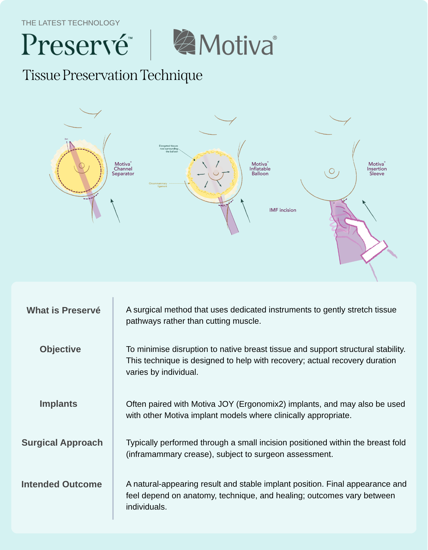 Typically used in standard breast augmentation procedures. | Compatible with Motiva Preservé™ or standard incision methods, subject to surgeon’s assessment. | Often combined with Motiva Ergonomix® or JOY™ implants; performed via small inframammary incision. |