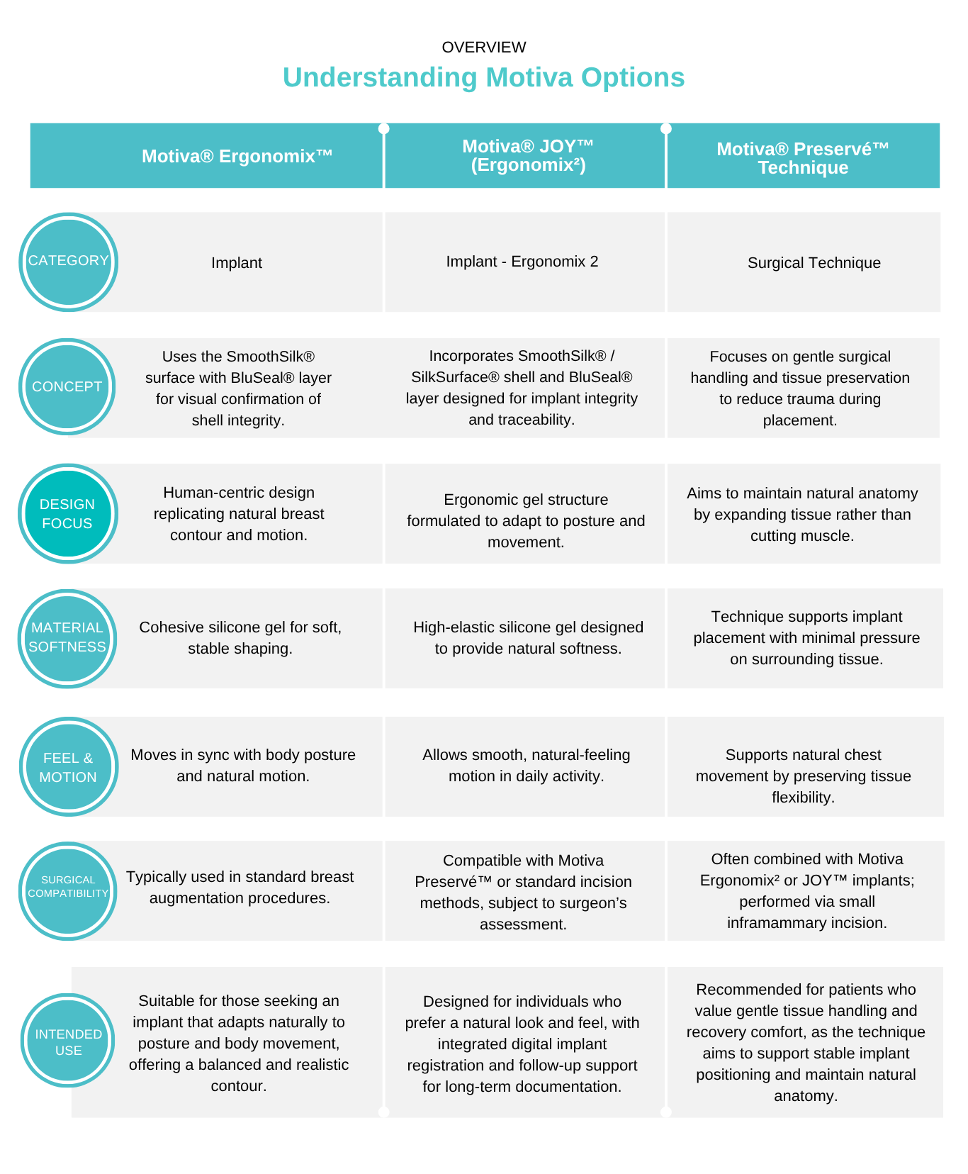 | Motiva® Ergonomix™ | Motiva® JOY™ (Ergonomix®) | Motiva® Preservé™ Technique | |